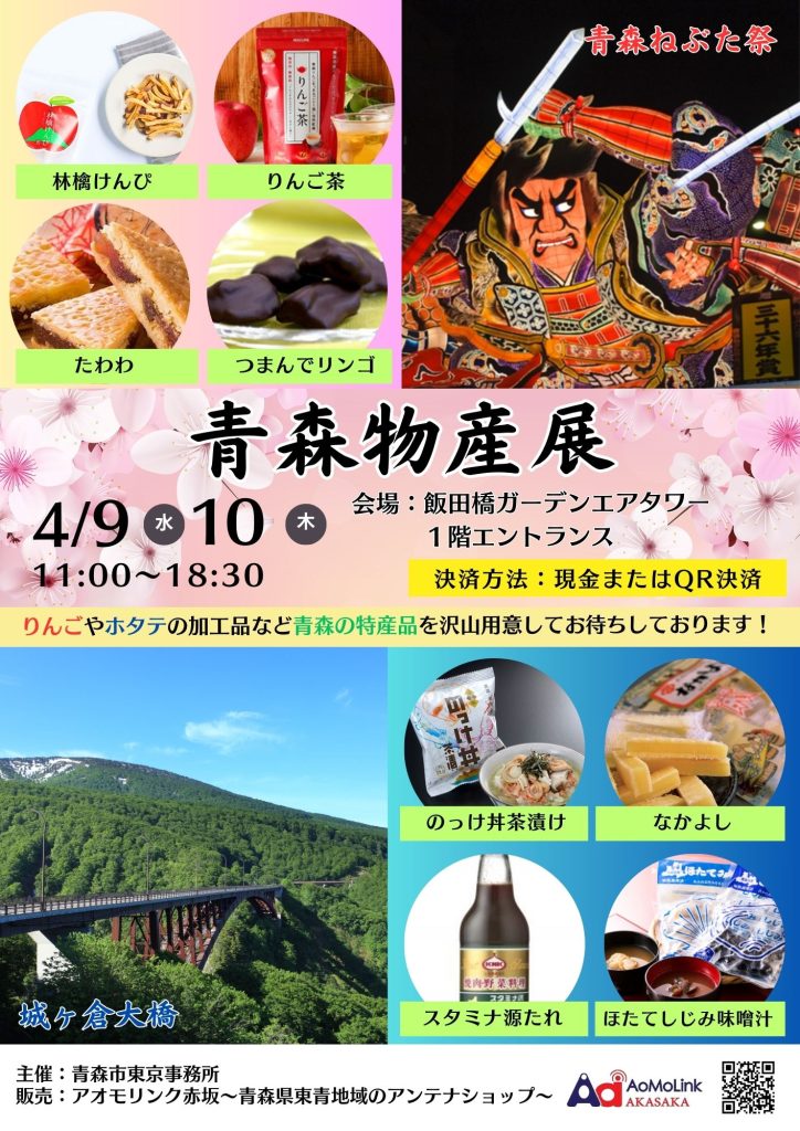 4月9日(水)、10日(木)に飯田橋ガーデンエアタワーで青森物産展を開催いたします。